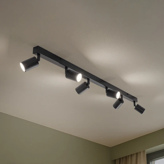 The GU10 ceiling spotlight Top in black finish is made of steel and consists of a long canopy and six cylindrical spotlight heads arranged in a row. The latter are adjustable so that the light can be directed to the desired area.