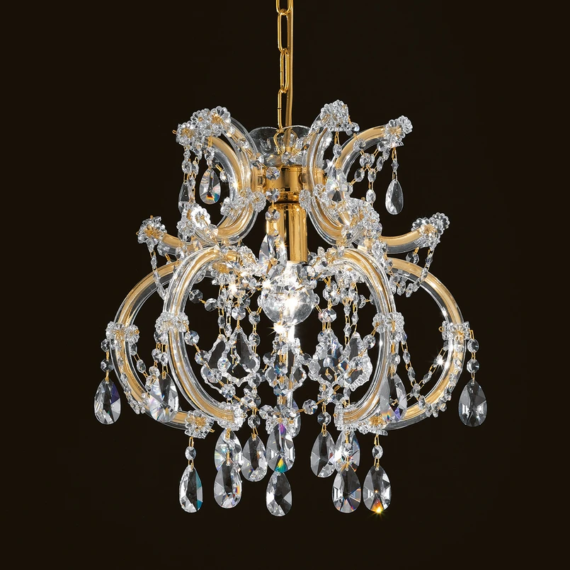 The Deira hanging light is the result of transparent glass elements complemented and accentuated by gold-shimmering surfaces. The shape of this hanging light is reminiscent of a crown that has been turned upside down, with the intention that the domed structure acts as a closed lampshade. 40 cm high and with the same size diameter, a 100 watt bulb sits in the core of the piece. The crystals are first distributed along the curved metal arms, which boast a gold-coloured surface coating. These are followed by some of the tails that run from the top, with their varying heights resulting in the main shape of the hanging light. Ideal for use in larger spaces as a complement to multiple hanging lights of the same structure. A dimmer can be used, but is not included with the product.