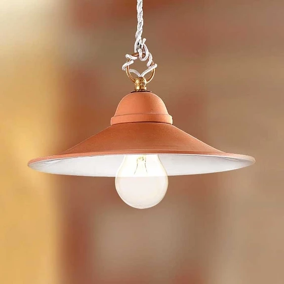The GIULIA hanging light creates a warm atmosphere in the kitchen or dining room. The flat ceramic lampshade has a natural tone on the outside; whilst the inside features a white glaze to create an attractive eye-catcher. Most of the light is directed downwards onto the table. The canopy is also made of clay-coloured ceramic.