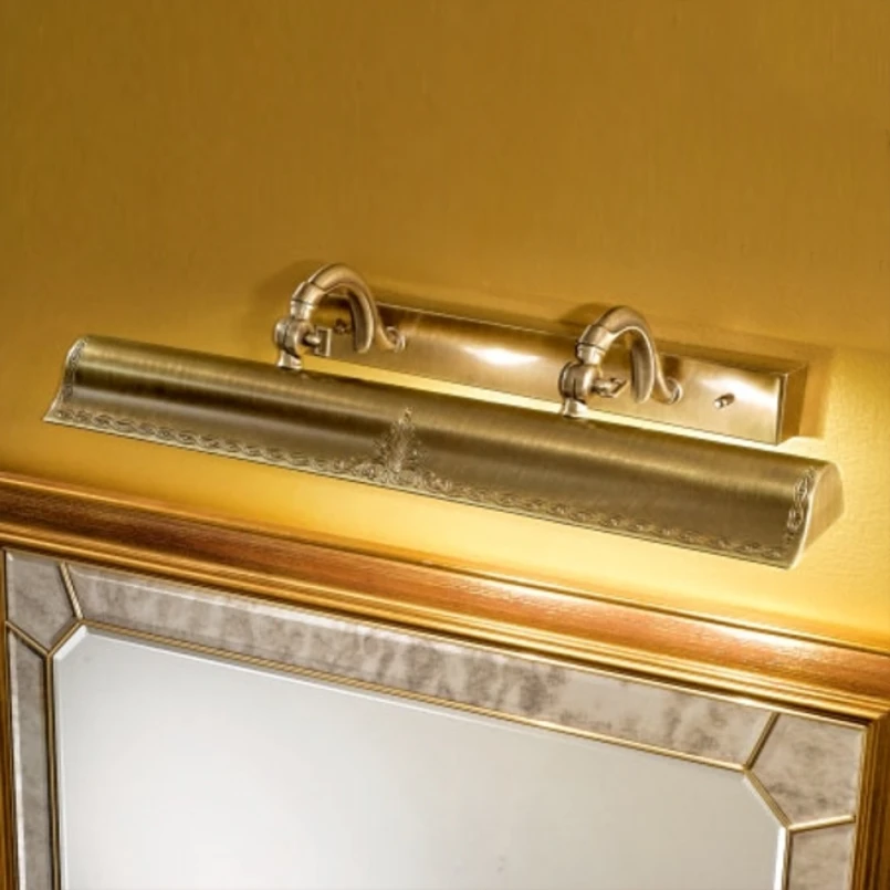 The version of the gold-coloured GALLERIA picture light with a 60 cm-wide diffuser produces a particularly wide light beam below. Its light is similar to that of a work light, but its purpose is to provide lighting in the direction of your gaze; on a picture or mirror for example. It is itself a beautiful decorative piece for the wall. Not least because of the perfectly centred engraved pattern on the front. Uncomplicated in its usage: Once installed, the GALLERIA picture light is securely attached to its robust base and can be easily switched on and off via the switch on the wall mount. Modern living room lighting can be simple and beautiful with this light.