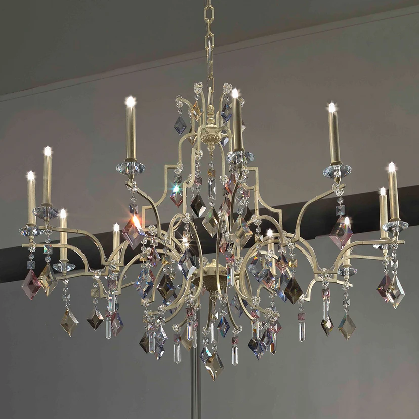 The Gracia hanging light exudes elegance and exclusivity, yet modern charm at the same time. The frame is painted in an ivory colour and designed impressively and extraordinarily, with its widely expansive shape. For brilliant general lighting in the space, there are twelve halogen light bulbs sitting in the sockets above, whose fixtures are shaped like tapered candles, and which makes the hanging light look like a candelabra. Diamond-shaped, square and round prisms made of crystal glass in bright colours are strung into chains and draped all around the decorative frame, making the hanging light a colourful eye-catcher in the space.