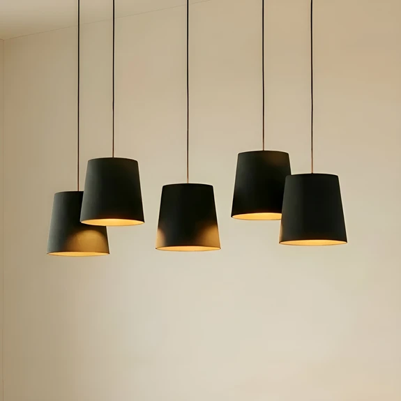 Dining room pendant lamp Thamila with five fabric lampshades and an oak ceiling mountThamila is a light dispenser for the living area, which convinces with a special flair and also brings a natural touch to the room through the oak ceiling mount. The five round shades are made of fabric and have a black surface, which on the one hand has a striking effect and on the other hand causes a cozy dimming of the light, which can then only emerge downwards unhindered and there illuminate the table surface well and brightly. Especially a dining table benefits from such a form of lighting and it is then bathed in a beautifully cozy light that invites you to feel good and linger. Not only their own family members feel comfortable in such a light, guests are also welcome and certainly appreciate the comfort.
