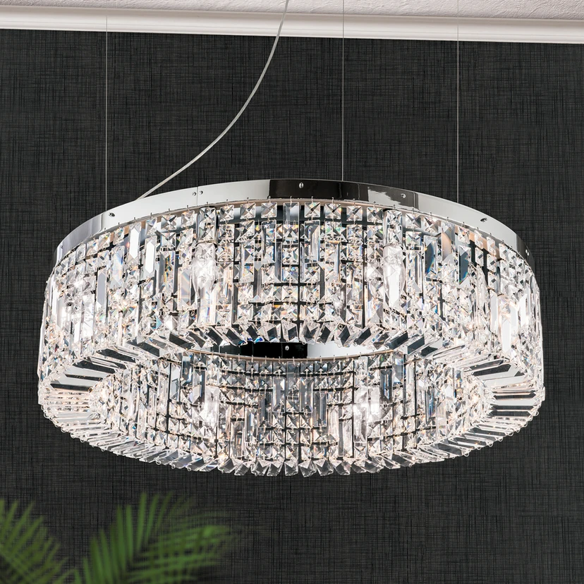 The sight of this beautiful light object makes any onlooker dream - of a festive dinner in a family setting or a glamorous encounter in a hotel. The lampshade of this hanging lamp consists of a chrome-plated ring whose form is continued by identically-designed crystal ornaments. Asfour crystals with a unique brilliance were used, which, in combination with the light refraction, create wonderful light accents. The lamp can be installed in a suspension height between 70 and 170 cm as desired. This choice however, should only be made during its installation. Eight E14 light bulbs create a technical illumination. The light bulbs are not included (available as accessories).